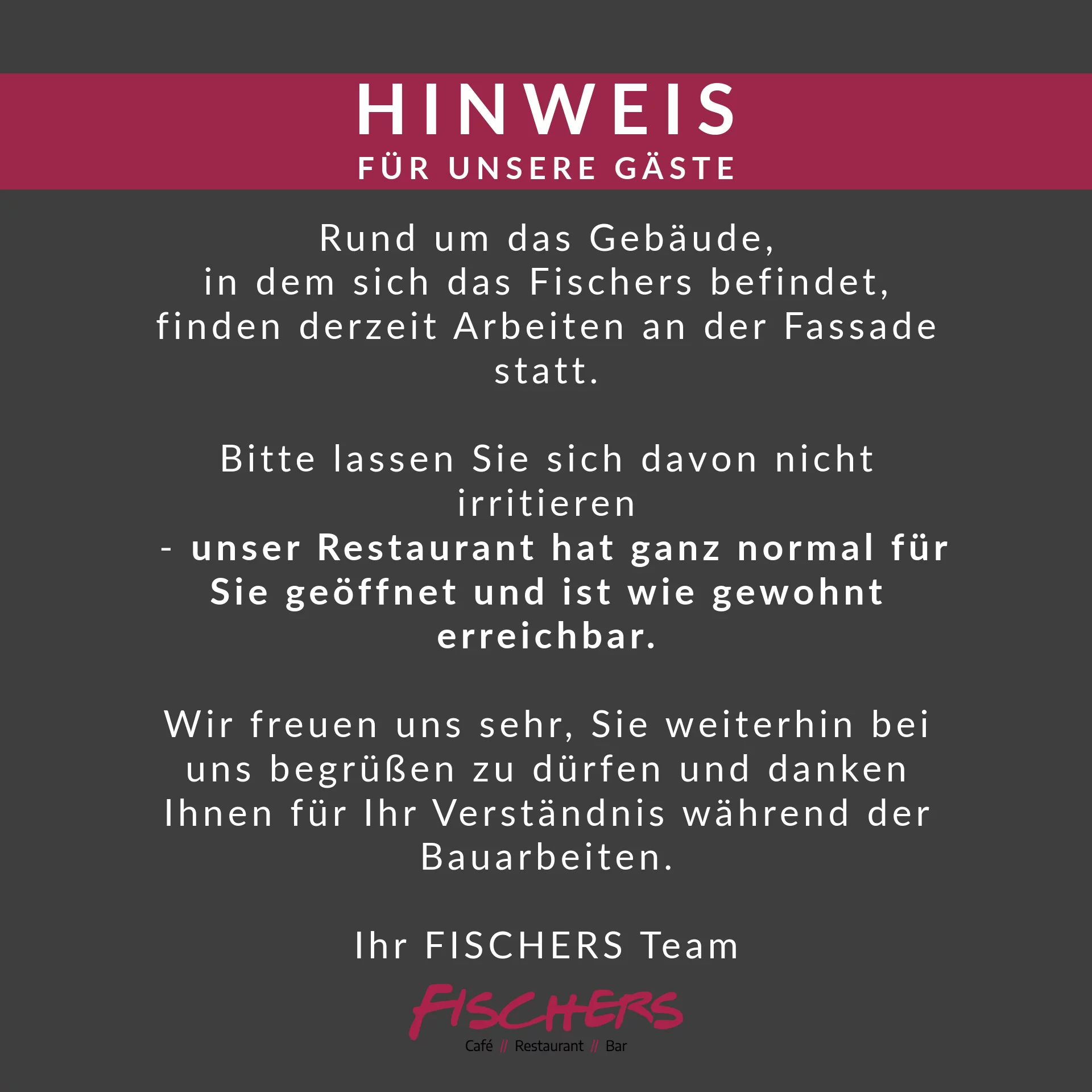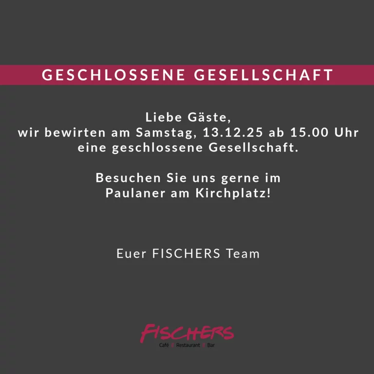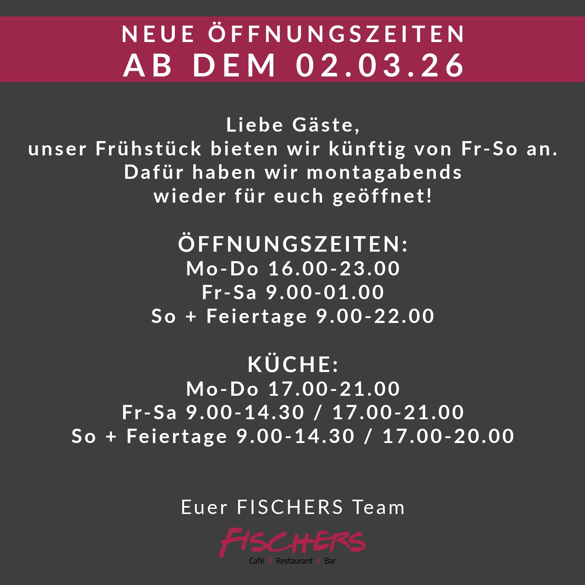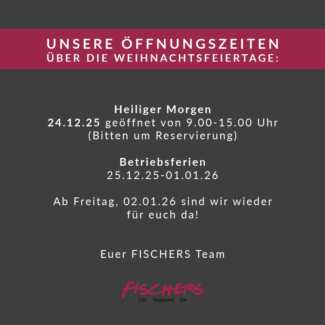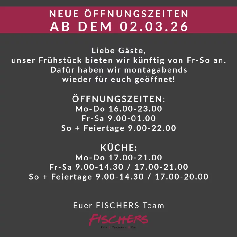 Bereits seit 2006 gibt es das FISCHERS. Schon damals, sowie heute überzeugen wir mit einer großen Auswahl an Frühstücksvariationen, exzellenten Kaffeespezialitäten, frischen Kuchen & Torten am Wochenende und einer großen Auswahl an Cocktails und Weinen zum Dinner. Egal ob jung oder alt, als Familie oder Single, zum Business Gespräch oder zur Familienfeier - alle sind bei uns jederzeit herzlich willkommen. Eine gelungene Mischung aus Café, Restaurant und Bar in angenehmer Lounge Atmosphäre!